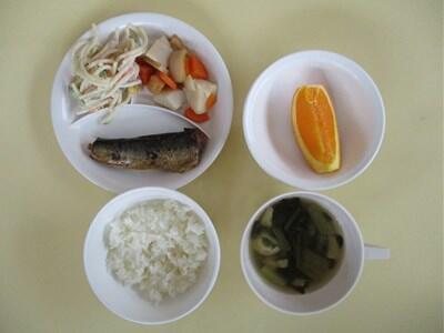 ・ごはん ・いわしの生姜煮 ・スパゲティサラダ ・里芋とさつま揚げの煮物 ・オレンジ ・みそ汁