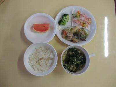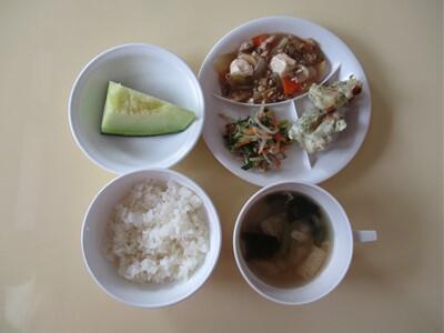 ・ごはん ・雷豆腐 ・おかか和え ・ちくわの磯辺揚げ ・メロン ・みそ汁
