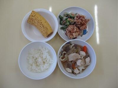 ・ごはん ・鶏肉の唐揚げ ・おかかマヨ和え ・バナナ ・けんちんうどん