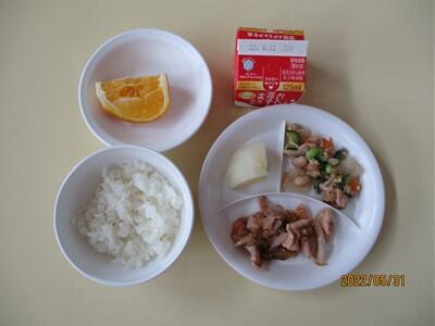 ・ごはん ・鶏肉のマーマレード焼き ・五目豆 ・オムレツ ・オレンジ ・牛乳