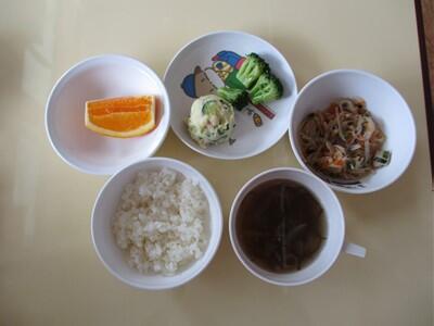 ・ごはん ・チャプチェ ・ポテトサラダ ・ブロッコリー ・みかん ・スープ
