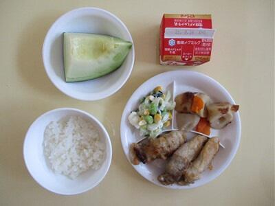 ・ごはん ・豚肉のバーベキューソース ・ちくわの煮物 ・グリーンサラダ ・メロン ・牛乳