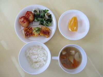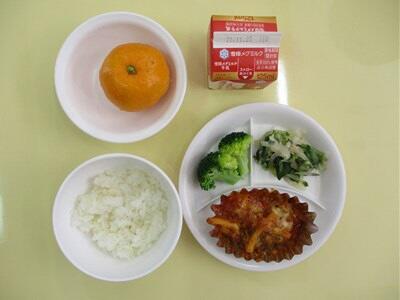 ・ごはん ・鶏つくね ・ブロッコリー ・ひじきの煮物 ・オレンジ ・牛乳