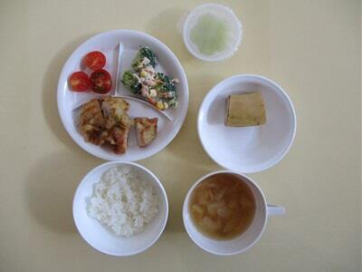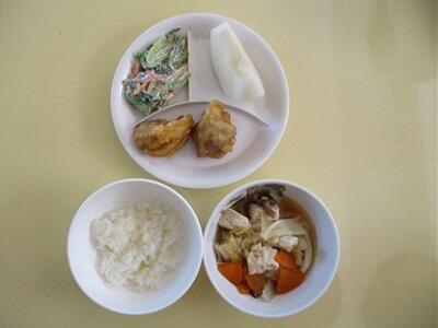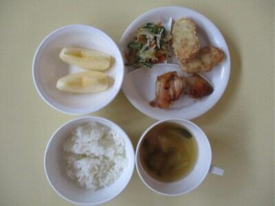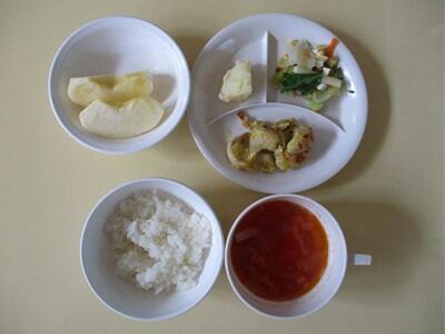 ・ごはん ・鶏のから揚げ ・チーズサラダ ・コンソメポテト ・りんご ・牛乳