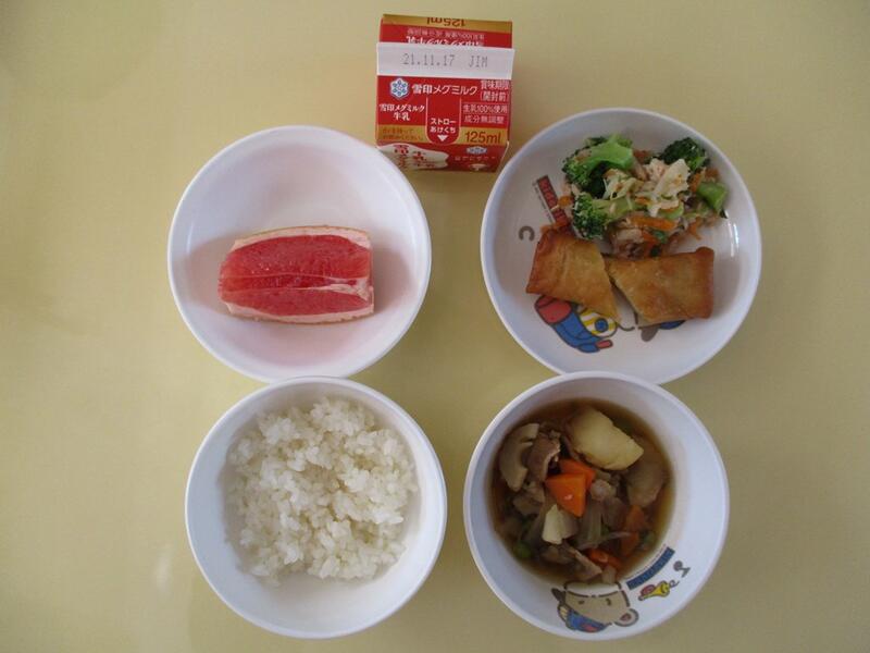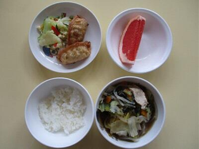 ・ごはん ・肉じゃが ・ツナ和え ・春巻き ・グレープフルーツ ・牛乳