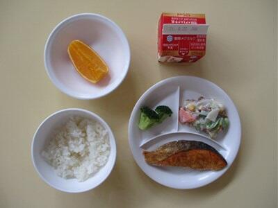 ・ごはん ・鮭のカレー風味焼き ・納豆サラダ ・ブロッコリー ・オレンジ ・牛乳
