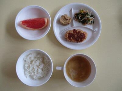 ・ごはん ・コーンコロッケ ・わかめサラダ ・がんも煮 ・グレープフルーツ ・味噌汁