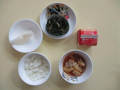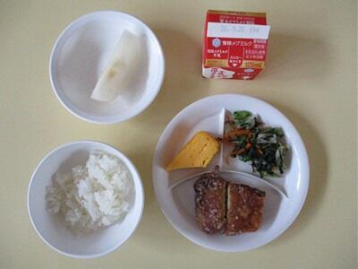 ・ごはん ・モロの竜田揚げ ・厚焼き玉子 ・磯和え ・梨 ・牛乳