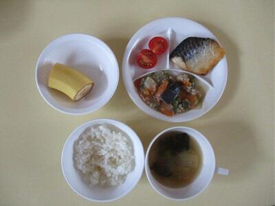 ・ごはん ・鯖のみりん焼き ・ミニトマト ・なすのみそ炒め ・バナナ ・味噌汁