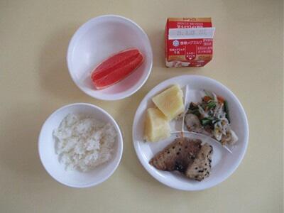 ・ごはん ・モロのごま焼き ・さつま芋のミルク煮 ・ゆかり和え ・グレープフルーツ ・牛乳