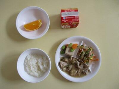 ・ごはん ・ポークジンジャー ・彩り和え ・高野豆腐煮 ・オレンジ ・牛乳