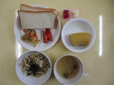 ・食パン ・和風ツナスパゲッティー ・ウィンナー ・カラフルサラダ ・バナナ ・スープ ・ジャム