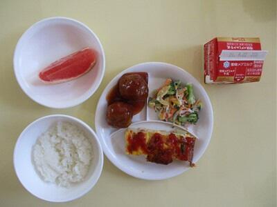・ごはん ・ジャーマンオムレツ ・ミートボール ・カニ風味サラダ ・グレープフルーツ ・牛乳