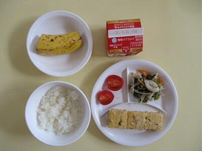 ・ごはん ・鶏肉のコーンフレーク焼き ・彩り和え ・ブロッコリー ・バナナ ・かき玉汁