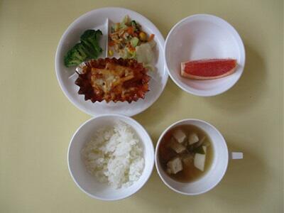 ・ごはん ・ミートグラタン ・コーンサラダ ・ブロッコリー ・グレープフルーツ ・味噌汁