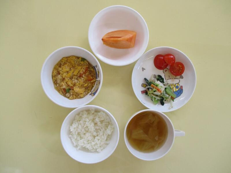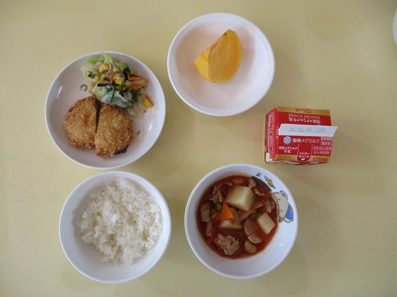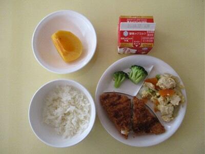 ・ごはん ・白身魚フライ ・ブロッコリー ・高野豆腐の卵とじ ・柿 ・牛乳