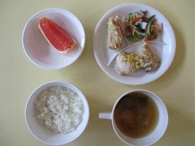 ・ごはん ・鶏肉のコーンマヨ焼き ・ゆかり和え ・ソーセージカレー揚げ ・グレープフルーツ ・味噌汁