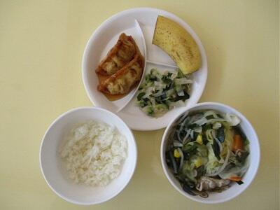 ・ごはん ・揚げ餃子の甘酢あんかけ ・大根サラダ ・塩野菜ラーメン ・バナナ