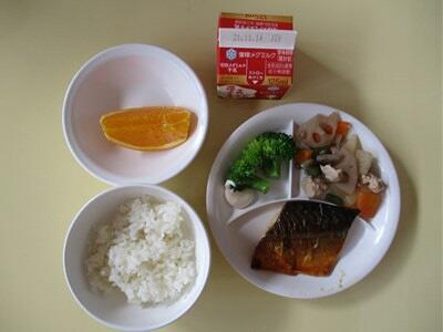 ・ごはん ・鯖の西京焼き ・筑前煮 ・ブロッコリー ・オレンジ ・牛乳