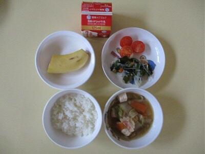 ・ごはん ・親子煮 ・ミニトマト ・青のりポテト ・バナナ ・具沢山味噌汁