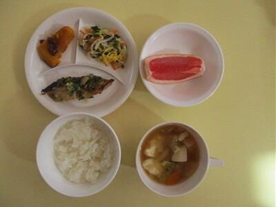 ・ごはん ・ホッケのねぎみそ焼き ・五色和え ・かぼちゃのいとこ煮 ・グレープフルーツ ・すいとん汁
