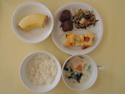 ・ごはん ・野菜たっぷりキッシュ ・塩昆布和え ・ミートボール ・バナナ ・白いんげんのポタージュ