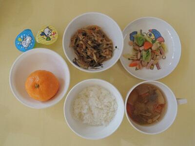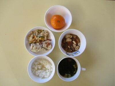 ・ごはん ・チャプチェ ・ビーンズサラダ ・ミニゼリー ・みかん ・たぬき汁