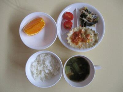 ・ごはん ・ポテトグラタン ・ミニトマト ・わかめサラダ ・オレンジ ・味噌汁