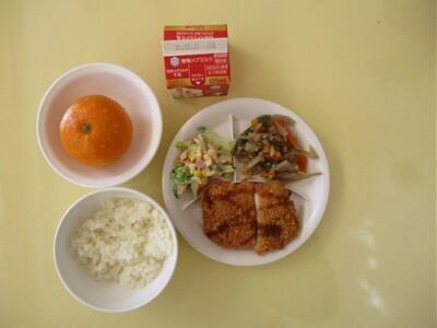 ・ごはん ・チキンカツ ・キャベツサラダ ・金平ごぼう ・みかん ・牛乳