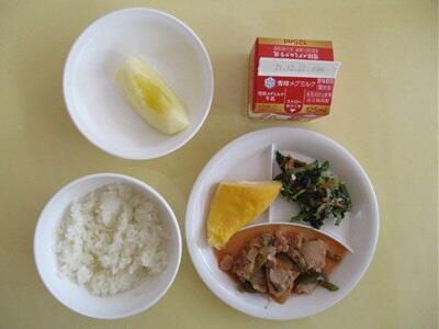 ・ごはん ・インド煮 ・ほうれん草ソテー ・春雨の酢の物 ・梨 ・牛乳
