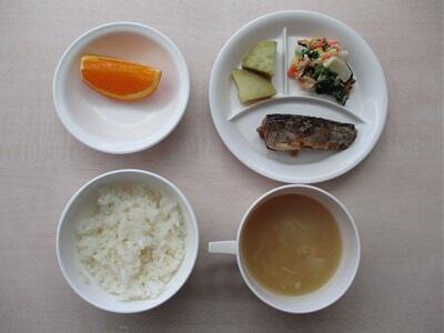 ・ごはん ・いわしのおかか煮 ・さつま芋の甘煮 ・白菜サラダ ・オレンジ ・味噌汁