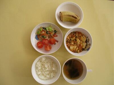 ・ごはん ・マーボー豆腐 ・ミニトマト ・野菜のナムル ・バナナ ・わかめスープ