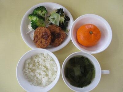 ・ごはん ・とんかつ ・わかめサラダ ・ブロッコリー ・みかん ・スープ