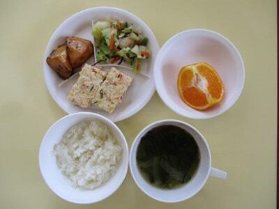・ごはん ・高野豆腐のオランダ煮 ・厚焼き玉子 ・ブロッコリーサラダ ・グレープフルーツ ・牛乳