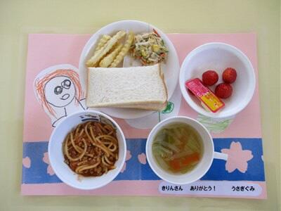・食パン ・ミートスパゲティ ・バンバンジーサラダ ・フライドポテト ・いちご ・スープ ・ジャム