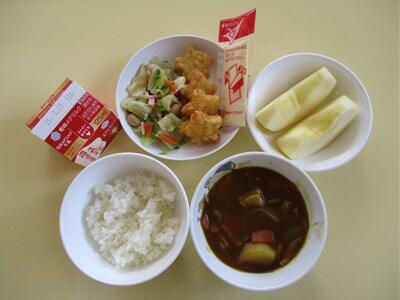・ごはん ・ポークカレー ・星ポテト ・ビーンズサラダ ・チーズ ・りんご ・牛乳
