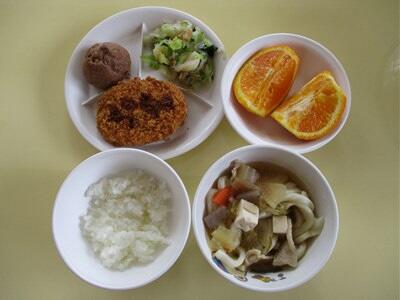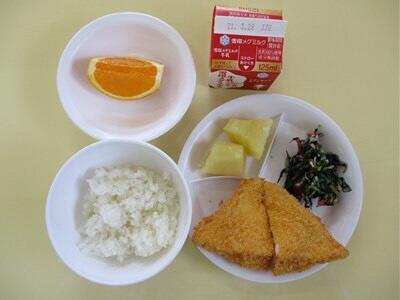 ・ごはん ・ハンペンチーズフライ ・磯和え ・さつま芋の甘煮 ・オレンジ ・牛乳