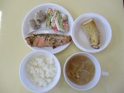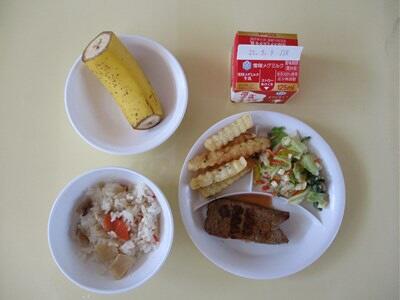 ・ごはん ・鮭の塩焼き ・がんも煮 ・ポテトサラダ ・バナナ ・たぬき汁
