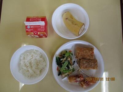 ・ごはん ・油淋鶏 ・コンソメポテト ・彩り和え ・バナナ ・牛乳