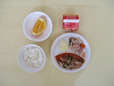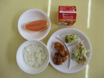 ・ごはん ・油淋鶏 ・キャベツサラダ ・粉ふきいも ・グレープフルーツ ・牛乳