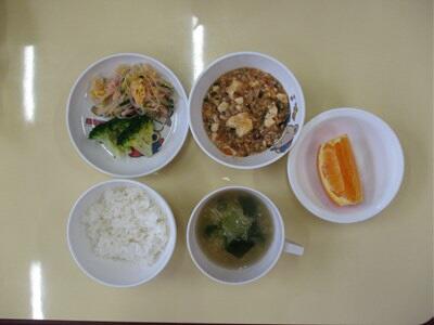 ・ごはん ・マーボー豆腐 ・焼売 ・彩り和え ・オレンジ ・中華スープ
