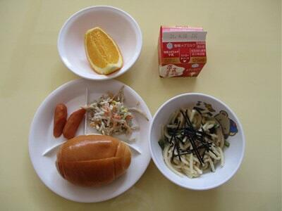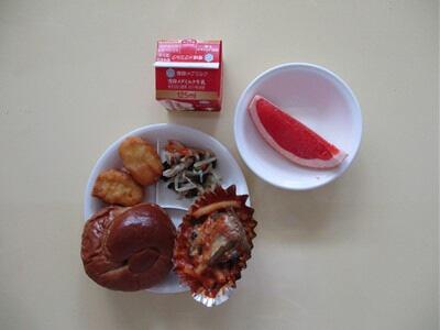 ・ジャムパン ・ナポリタン ・チキンサラダ ・しゅうまい ・はっさく ・牛乳