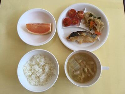 ・ごはん ・鯖の照り焼き ・卵焼き ・ブロッコリーサラダ ・グレープフルーツ ・豚汁