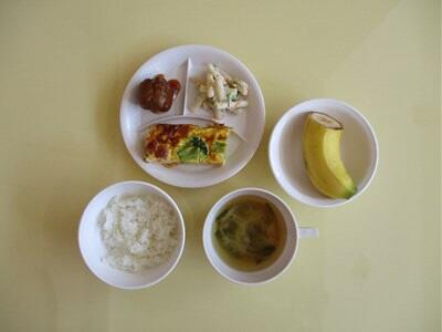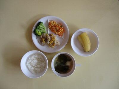 ・ごはん ・鶏肉のコーンマヨ焼き ・ブロッコリー ・人参とツナのシリシリ ・バナナ ・味噌汁