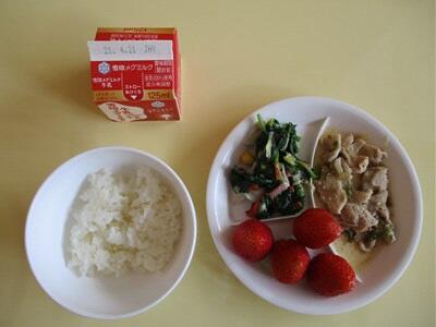 ・ごはん ・ポークジンジャー ・ほうれん草サラダ ・いちご ・牛乳