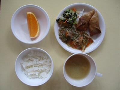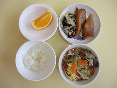 ・ごはん ・ピーマンの細切り炒め ・春巻き ・キャベツのナムル ・オレンジ ・みそ汁