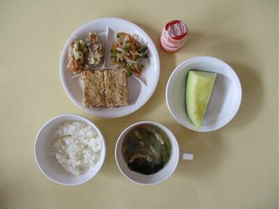 ・ごはん ・千種焼 ちくわの磯辺揚げ ・おかか和え ・メロン ・みそ汁 ・ヤクルト