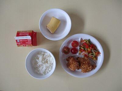 ・ごはん ・鶏肉のコーンフレーク焼き ・ミニトマト ・カラフルサラダ ・バナナ ・牛乳
