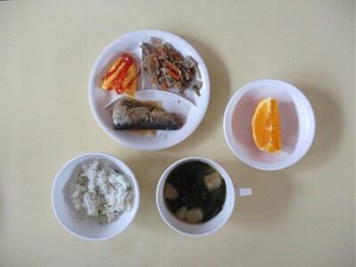 ・菜飯ごはん ・いわしのごま味噌煮 ・金平ごぼう ・チーズオムレツ ・オレンジ ・みそ汁