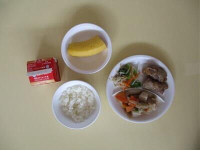 ・ごはん ・豚肉のアップルソース ・お浸し ・根菜の煮物 ・バナナ ・牛乳